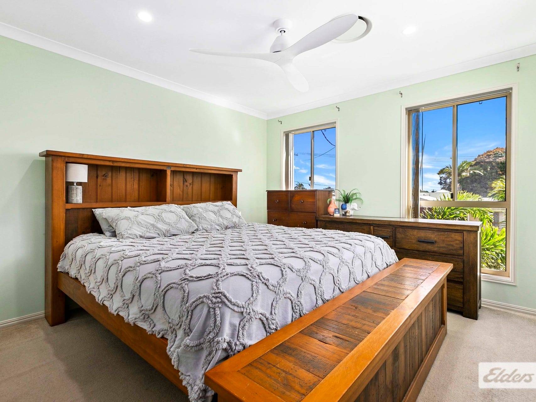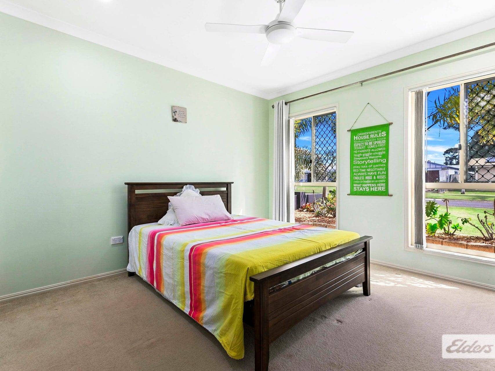 * Roomy master bedroom suite with walk in robe, carpeted floors and ceiling fan