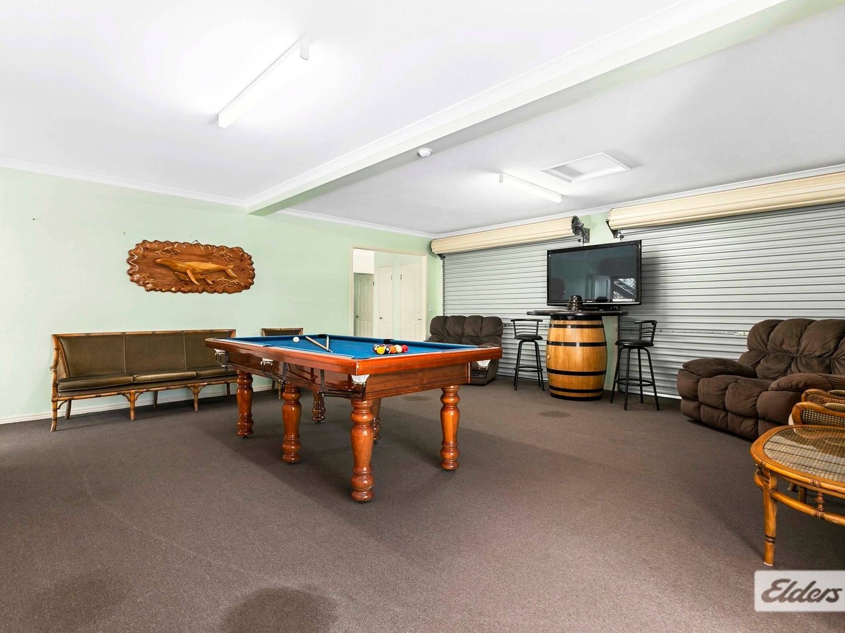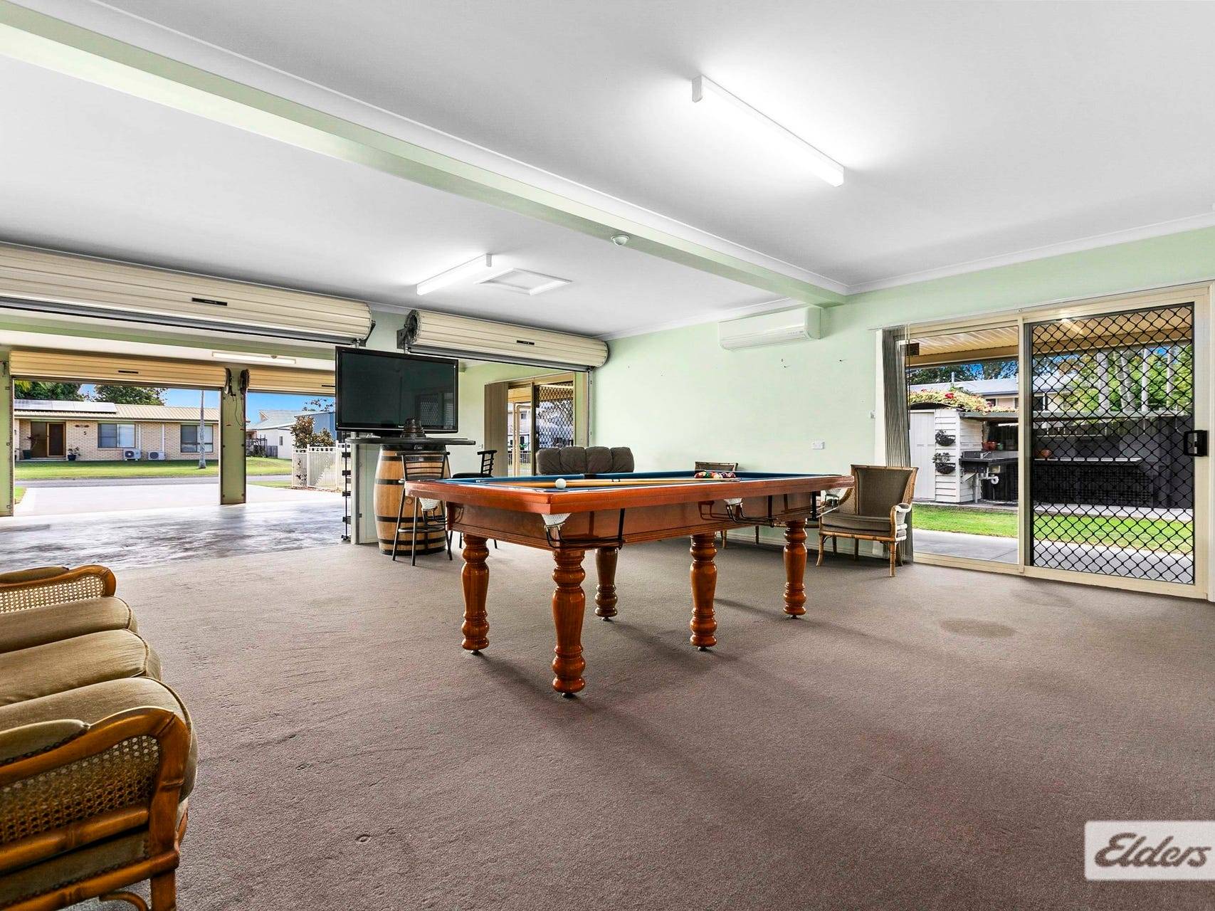 * An oversized carpeted rumpus/games room with air conditioning and a 4-door sliding storage cupboard. The perfect space for the younger crowd to play a game of pool or curl up and watch movies