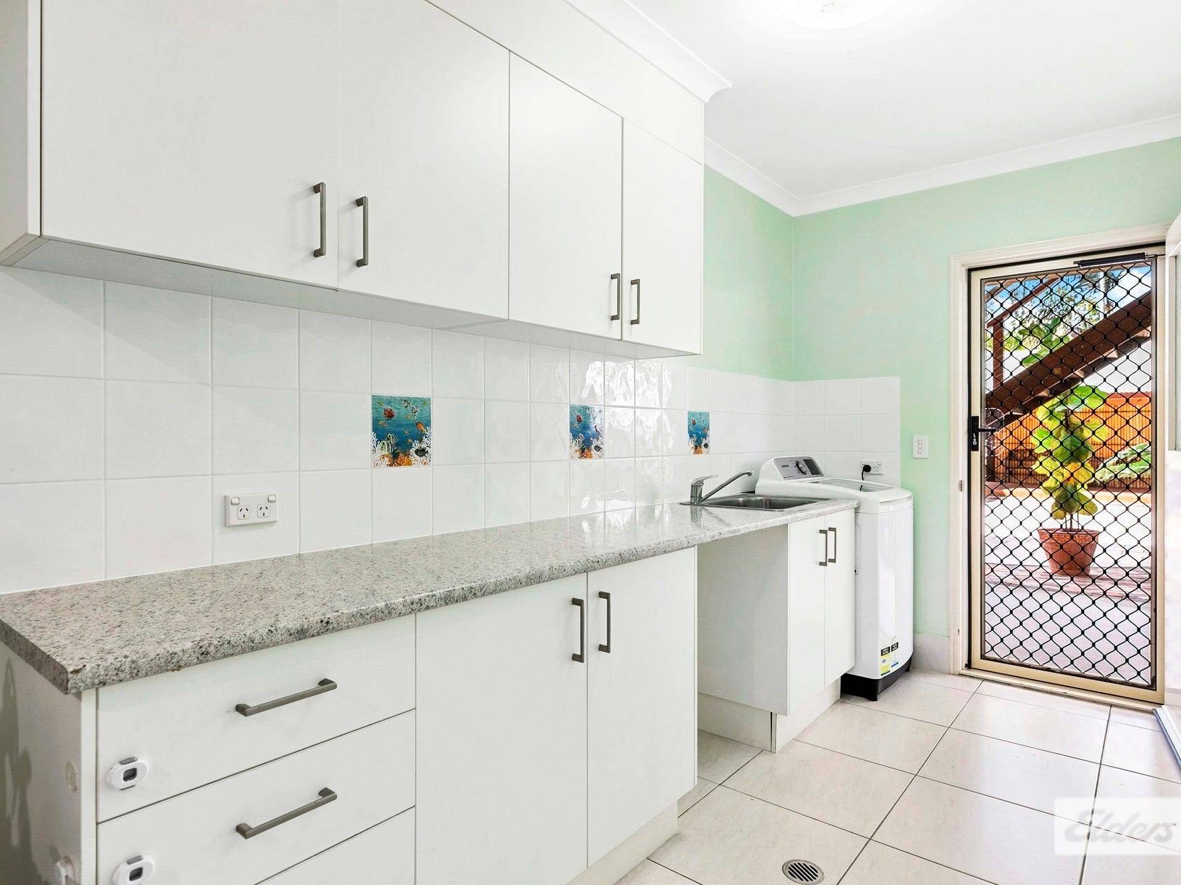 * A large laundry area showcasing enough bench space to combine this area with a kitchenette with further storage cupboards nearby