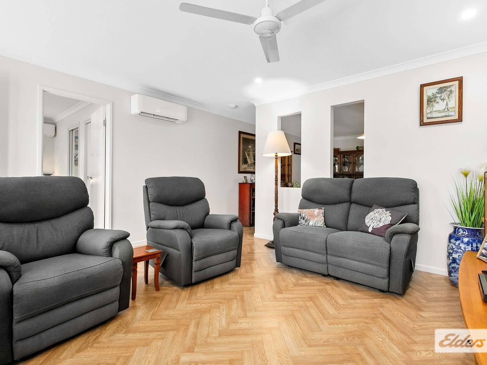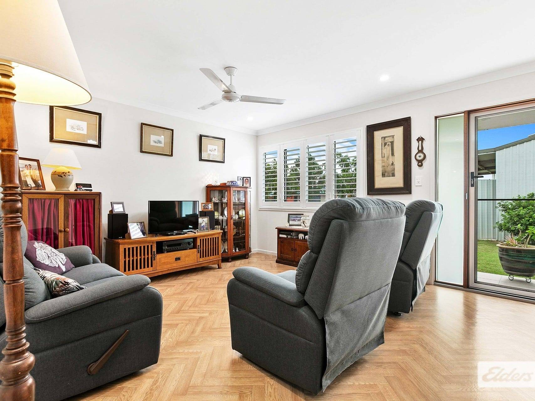 * Lounge room with plantation shutters at front and air-con