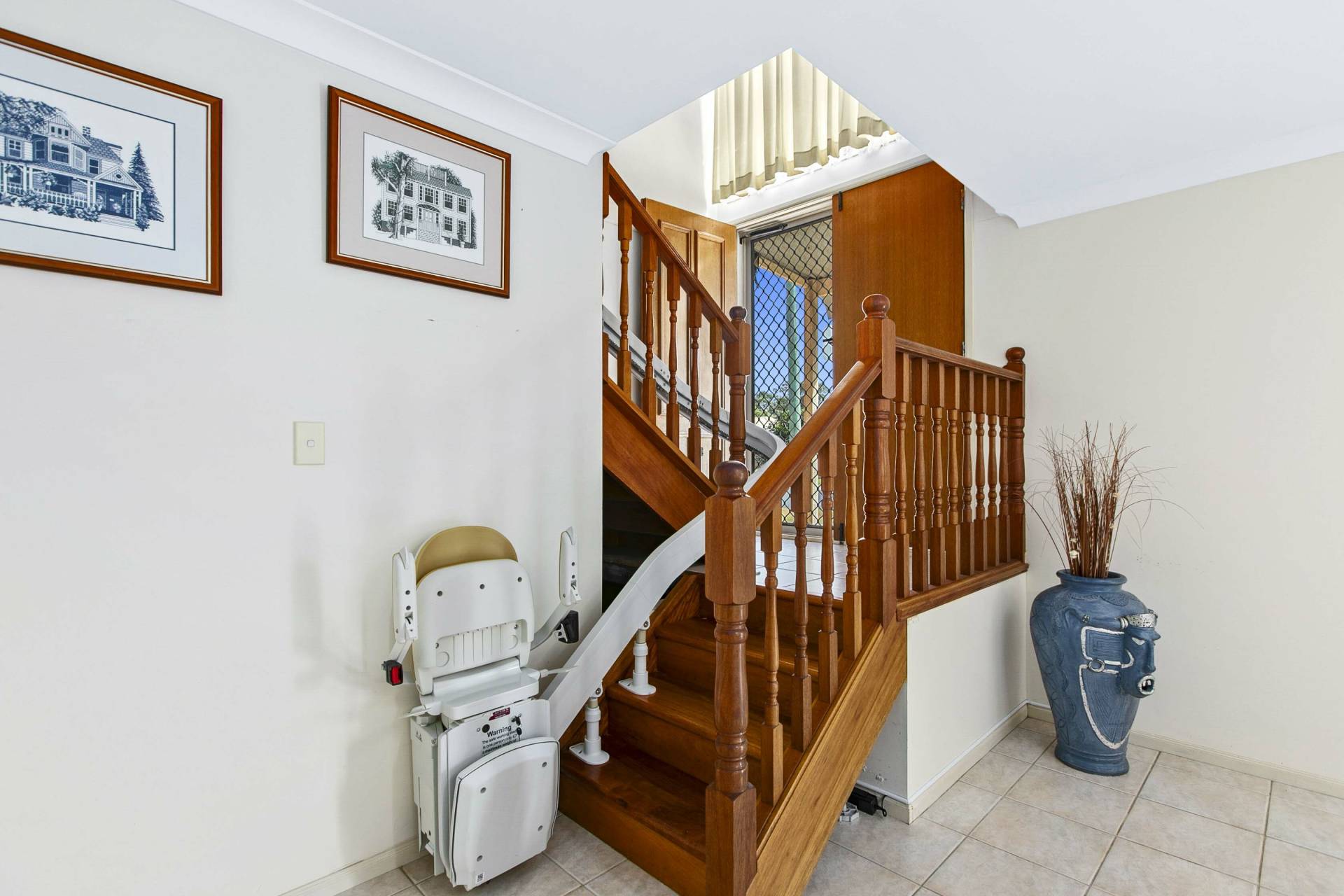 A timber stairwell fitted with a chair lift makes the home easily accessible for those with mobility concerns. While this grand home is in excellent condition, it offers the perfect opportunity to update and style it to your own taste.