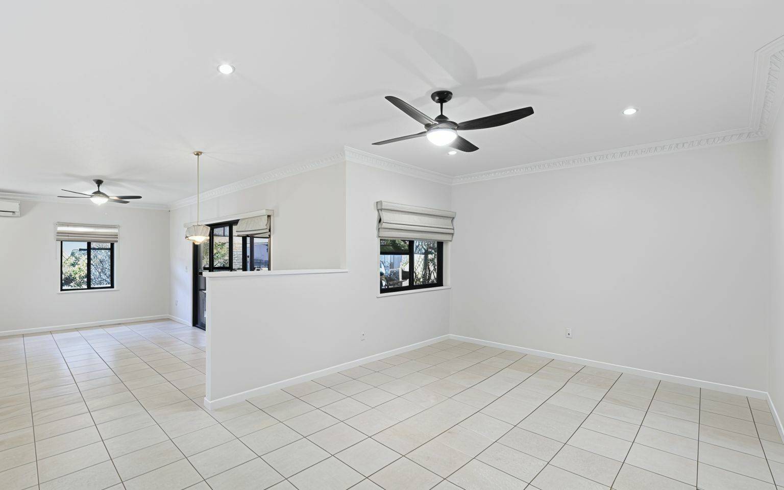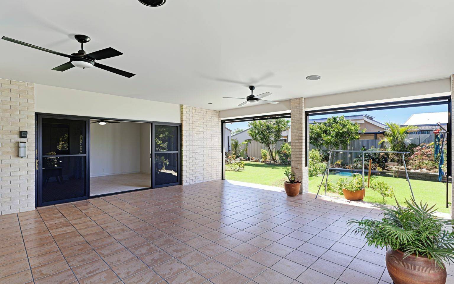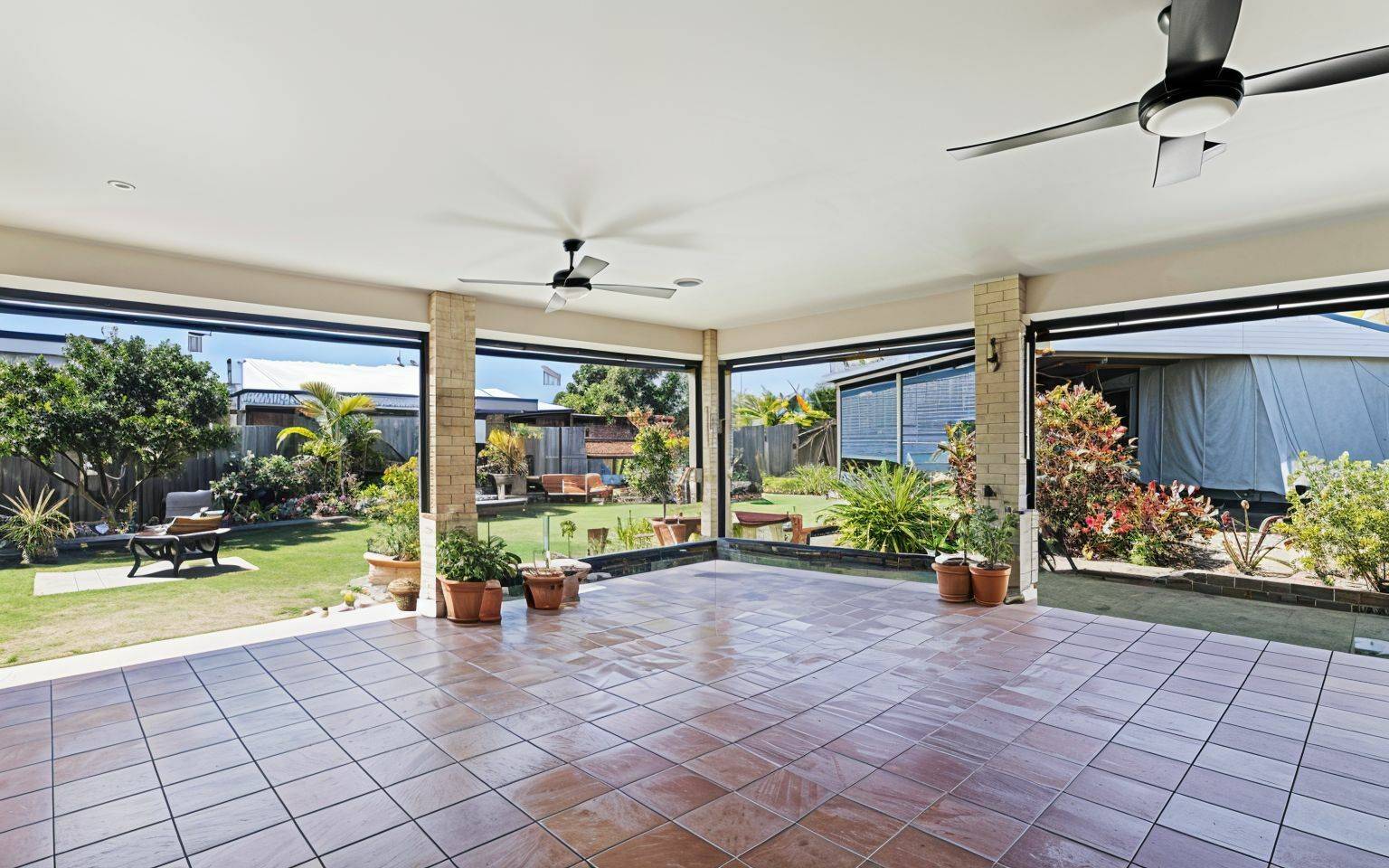 The open-plan living area flows seamlessly onto the large, covered patio overlooking the manicured gardens. It’s a fantastic spot for entertaining or just unwinding after a day at the beach. With ceiling fans, pull-down shades, and even an entertainment setup with TV and soundbar, you’ll be able to enjoy this space all year round.