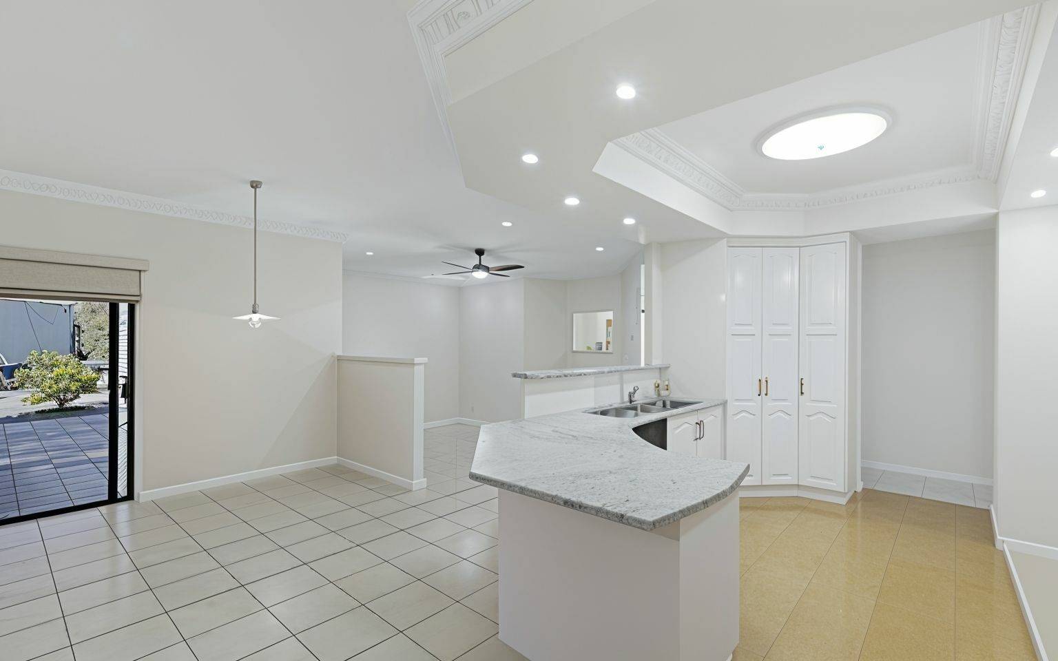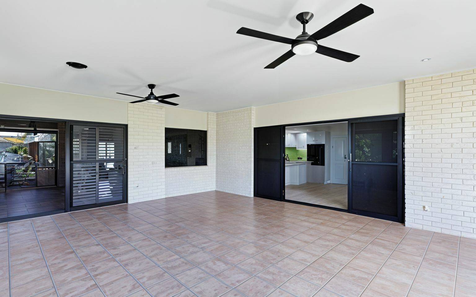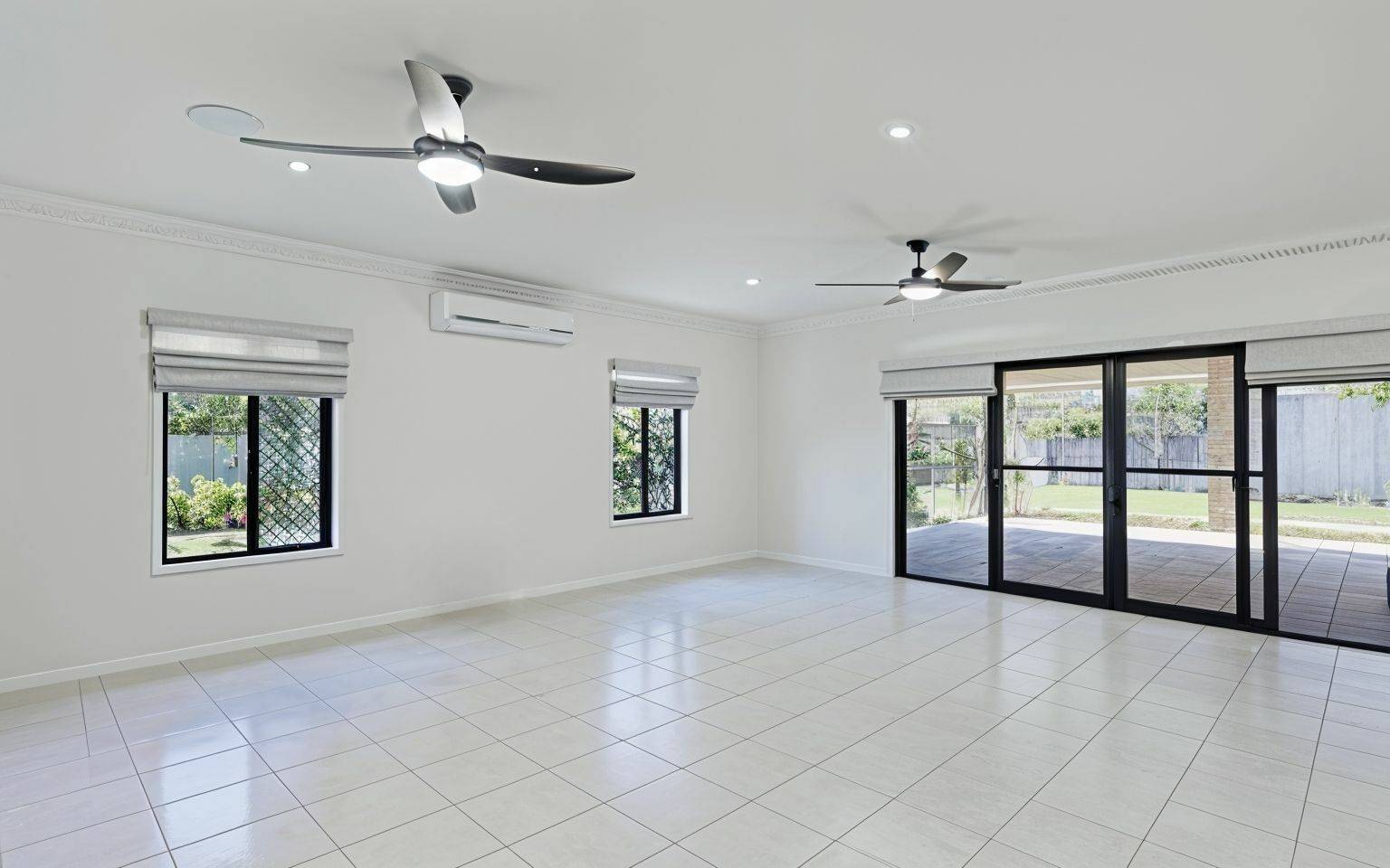 The open-plan living area flows seamlessly onto the large, covered patio overlooking the manicured gardens. It’s a fantastic spot for entertaining or just unwinding after a day at the beach. With ceiling fans, pull-down shades, and even an entertainment setup with TV and soundbar, you’ll be able to enjoy this space all year round.