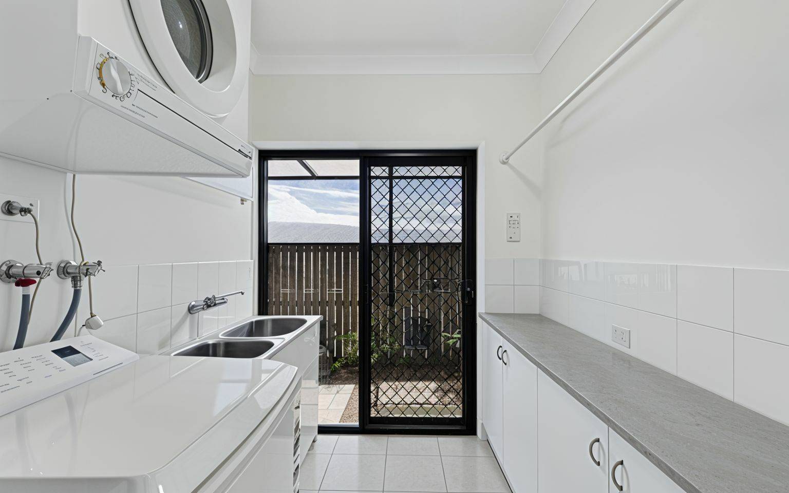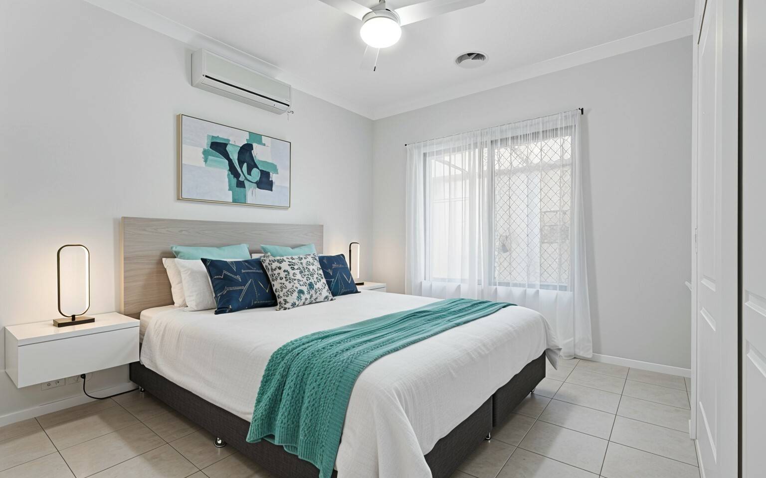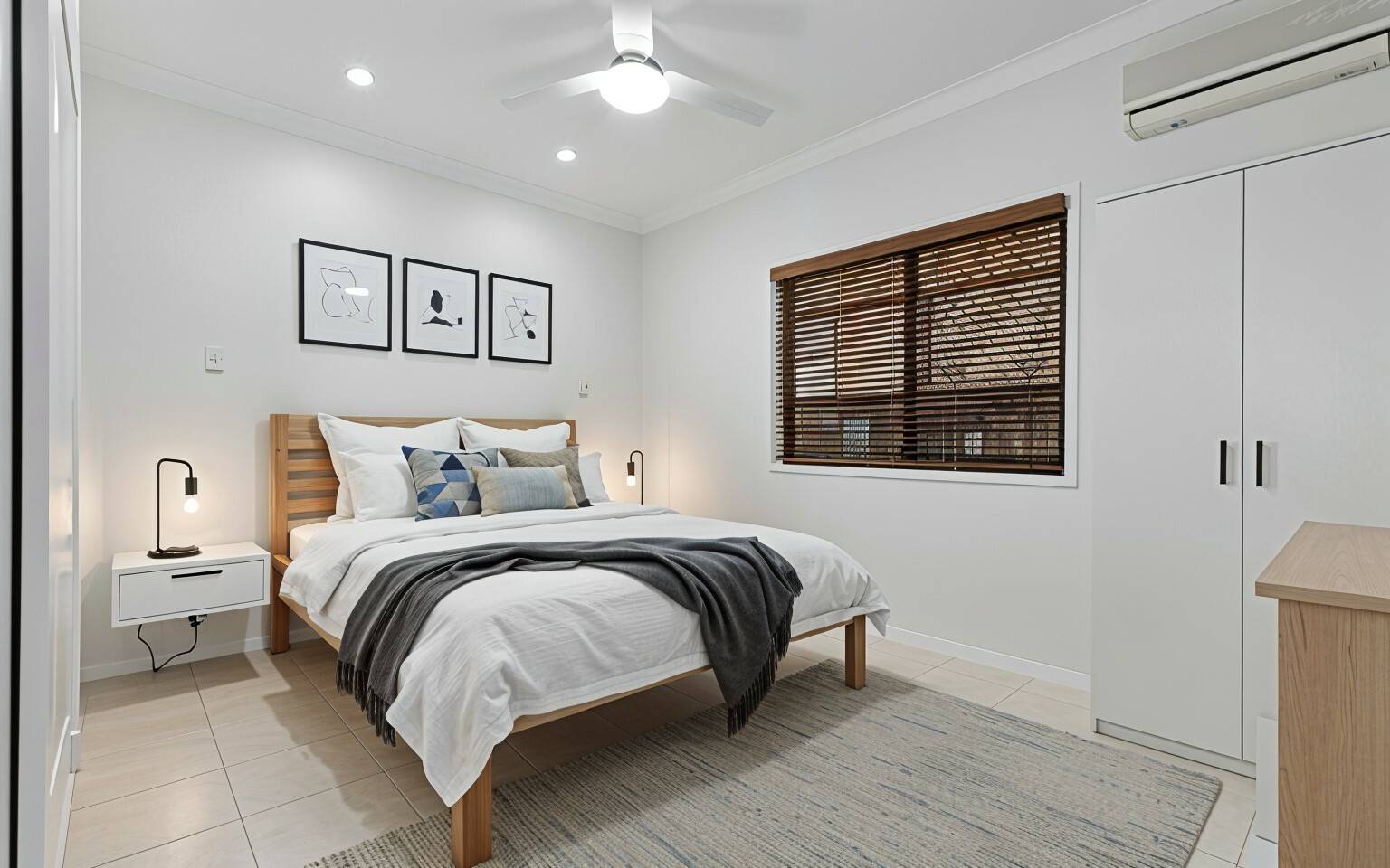 Inside, the thoughtful layout provides great separation between the master suite and the other bedrooms. The main bedroom is a true retreat, featuring a stylish ensuite with double vanities, a separate toilet with bidet, and sliding plantation shutters that open to the alfresco area. There’s also a walk-in robe that’s bright and airy—exactly what you’d hope for in a coastal home.