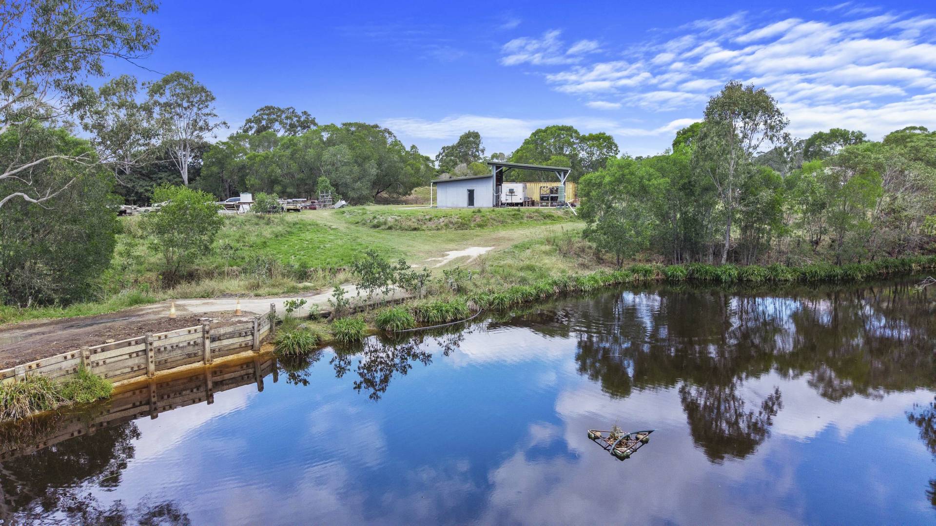 The property is fully fenced and gated, ensuring both privacy and security. A large, converted shed provides comfortable accommodation while you plan and build your dream home, featuring a lounge room, bedroom, kitchen, and bathroom. There’s also a partially built home positioned perfectly to capture the cooling breezes and scenic river views—the seller even has plans they’re happy to share to help you complete it.