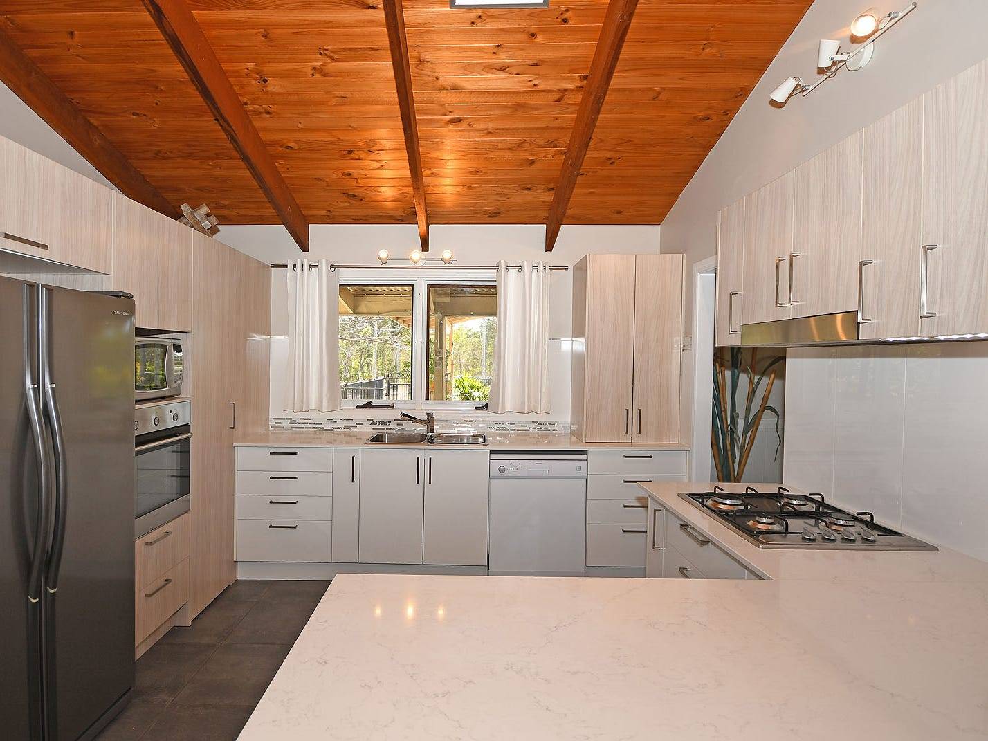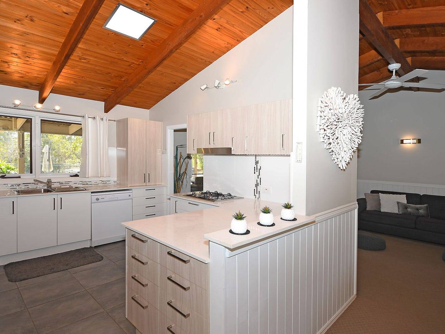 as the eating. With stone benchtops, stainless steel oven and gas stovetop, dishwasher.