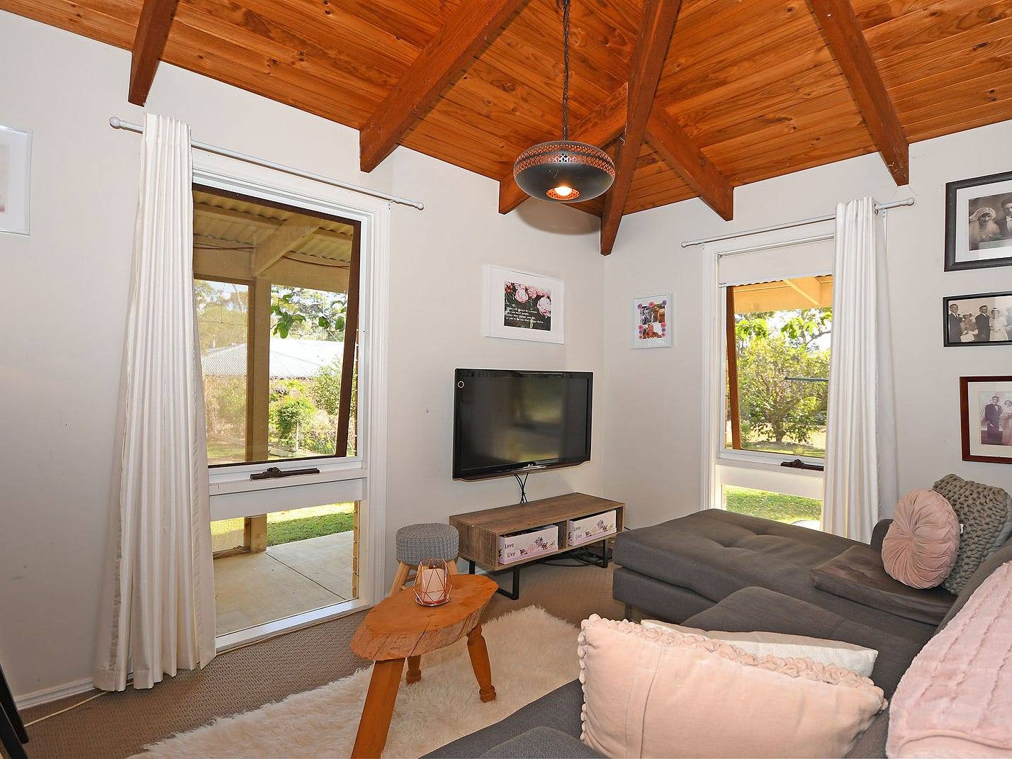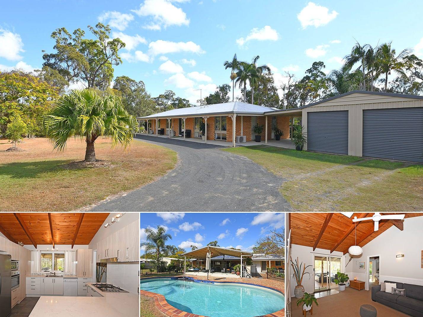 This beautiful, immaculate and versatile acreage home has a soulful air and very harmonious feel. The raked timber ceilings and skylights throughout gives the home a spacious, open and warm ambiance. You'll feel like you are living in your own resort. Spread out on 2 and 1/5 acres this inviting and unique home offers so much: