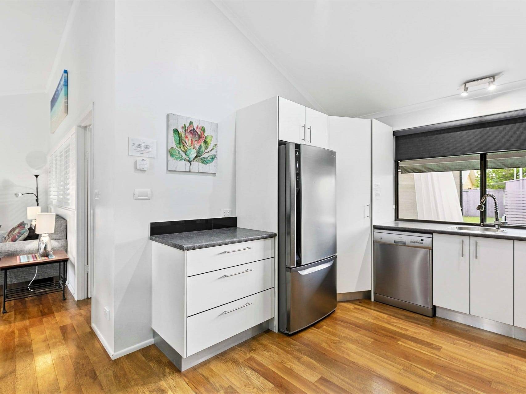 elements of elegance and comfort. Raked ceilings, timber-style flooring, plantation blinds